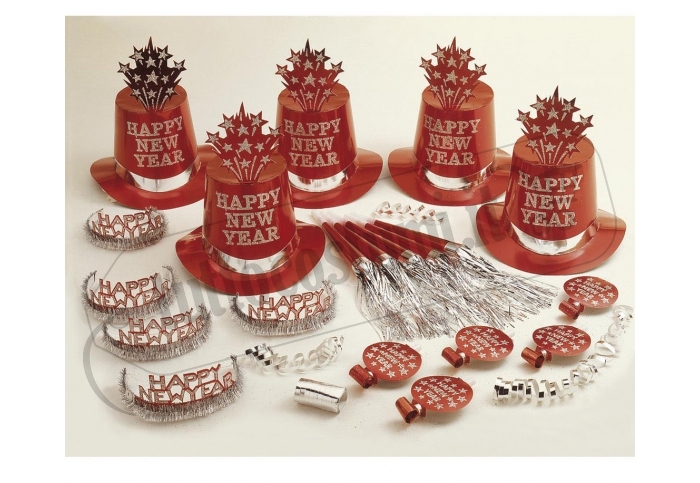 I party kit di Capodanno in vendita online propongono un set coordinato di accessori colorati da indossare l’ultima notte dell’ano. Di solito i party kit “Happy New Year” comprendono cappelli a cilindro, coroncine, trombe sonore, lingue sonore.